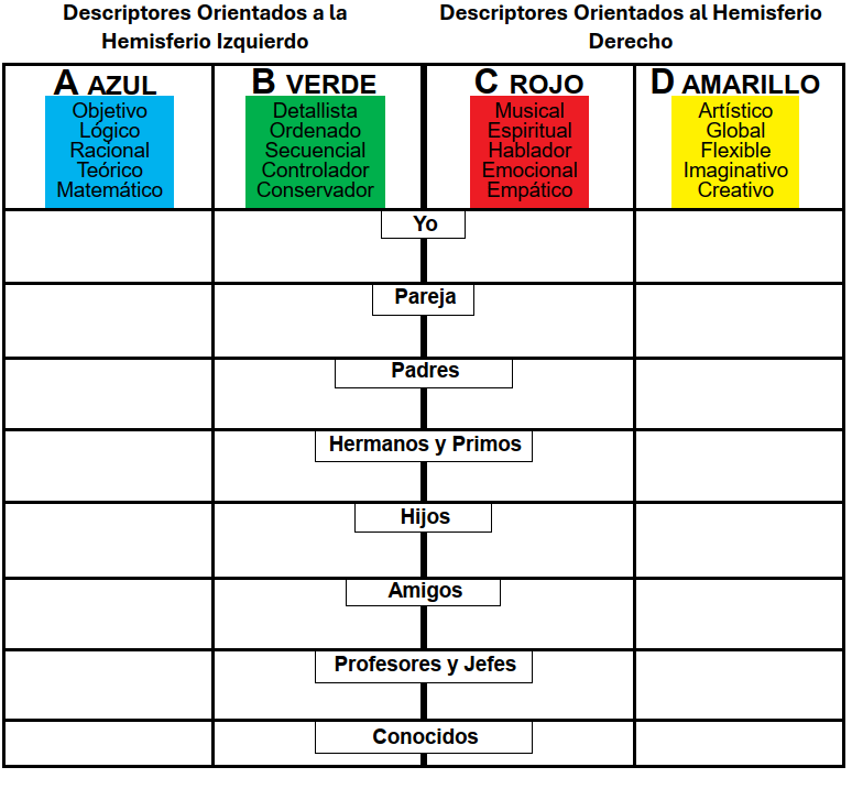 ¡Saludos a todos! El fin de semana pasado estuvimos en la JapanWeekend Madrid. Fue genial la experiencia!. Este finde nos vemos en la Expotaku Vitoria-Gasteiz! Hoy os traigo un Test para reflexionar sobre las diferencias de los perfiles de vuestros familiares y amigos. Recuerda que toda la información de los cuadrantes la puedes encontrar en mi libro Neurociencias y Educación. 2ºEdición Editorial La Muralla. Nos vemos este fin de semana en Vitoria-Gasteiz! Y ahora a pintar: Os animáis a...