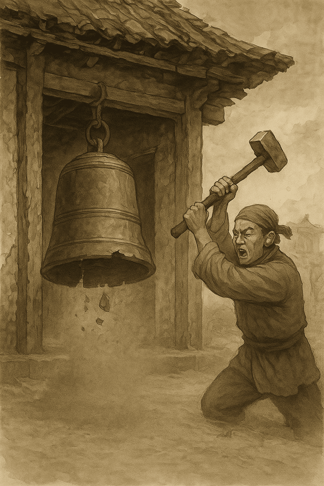 La familia Fan, uno de los mayores clanes del reino de Jin, al ser derrotada por sus enemigos debieron huir dejando atrás muchas de sus preciadas posesiones. Un día, un hombre que pasaba por la casa abandonada de la desdichada familia, vio una hermosa campana de bronce que colgaba sobre la puerta principal. Inmediatamente decidió robarla pero había un problema: la campana era demasiado grande y pesada.