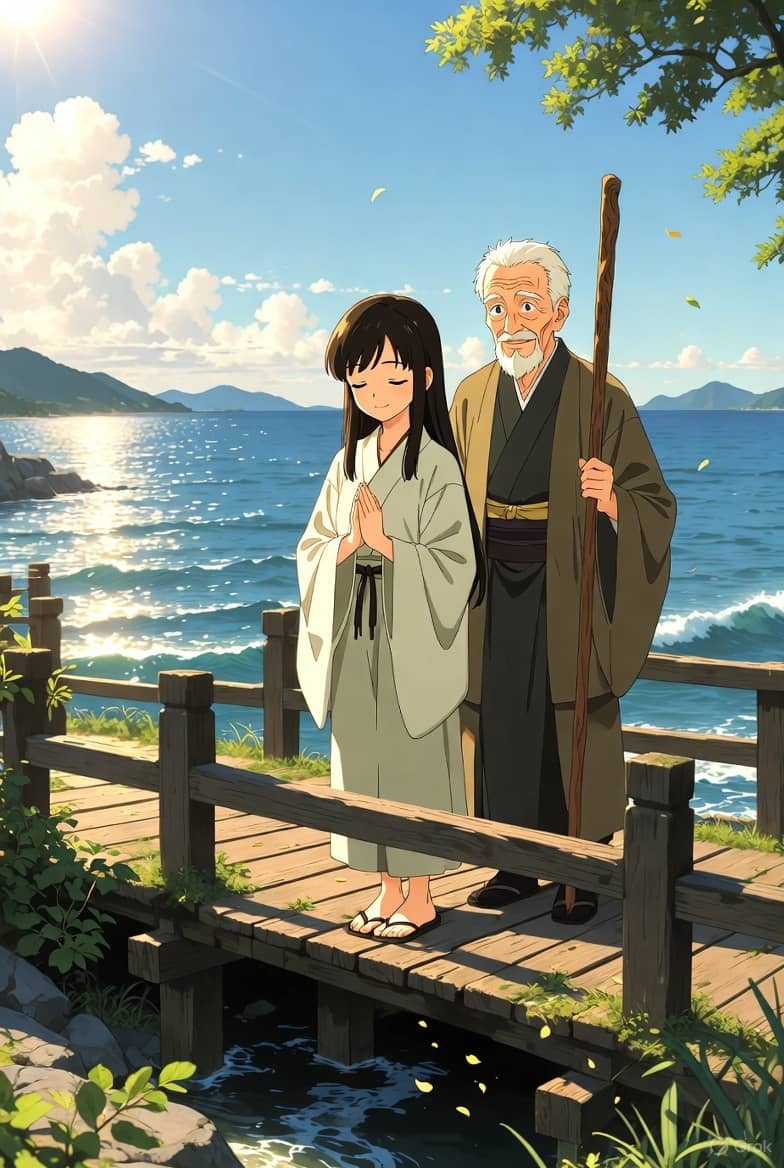 Un día, encontró en la orilla a un anciano tallador de madera, Maestro Ren. Él observaba las olas con una calma inquebrantable. Sora le contó su terror.