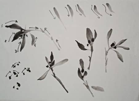 Principio técnico: En la tradición china, la mayoría de los estilos pictóricos utilizan un trazo de línea estructural (el «hueso» que da forma al objeto) antes de rellenar con color. La técnica Méi Gǔ Fǎ invierte este orden: la forma surge directamente del color y la tinta, sin contornos previos. El pintor confía en el gesto, en la presión, en la fluidez. No hay estructura que dicte: la forma emerge del proceso mismo.