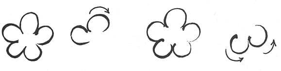 14. Los pétalos (5 por flor): Con tinta muy clara o tinta combinada con Pòmò. Cada pétalo es un toque ovalado: coloca la punta, presiona suavemente y levanta. No lo arrastres.